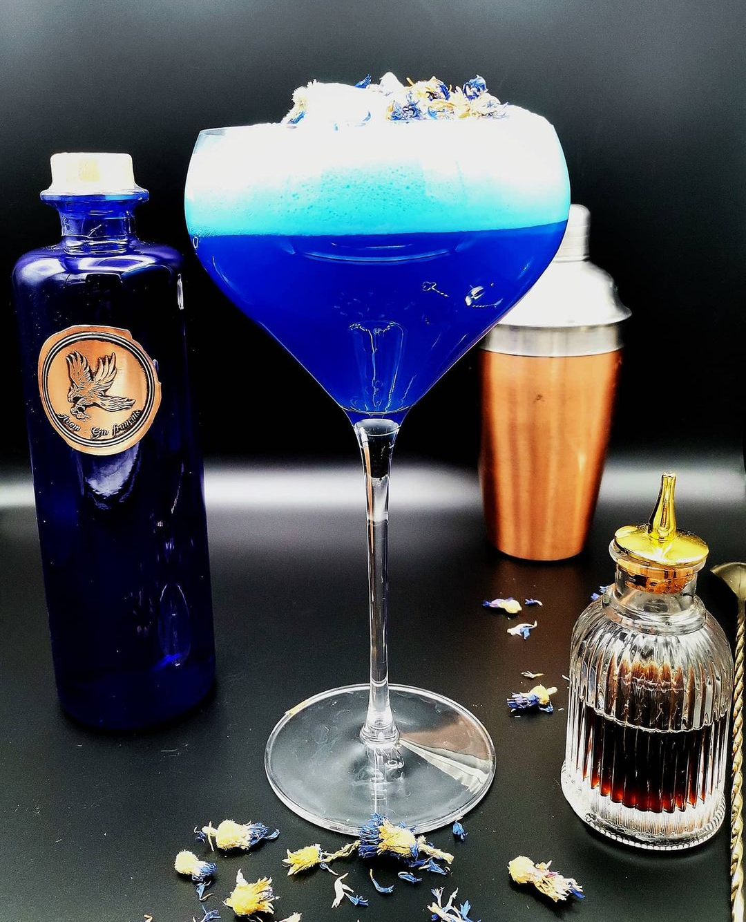 🦅 50 ml Gin Avem Hippolais 🍷 25 ml Starlino Rosé 🍸 10 ml Pimento dram par the bitter truth company 🌼 20 ml sirop de baies bleues et fleurs maison 🍋 20 ml jus de citron vert 🧉 10 ml Aquafaba 💧 2 gouttes de Creole bitters