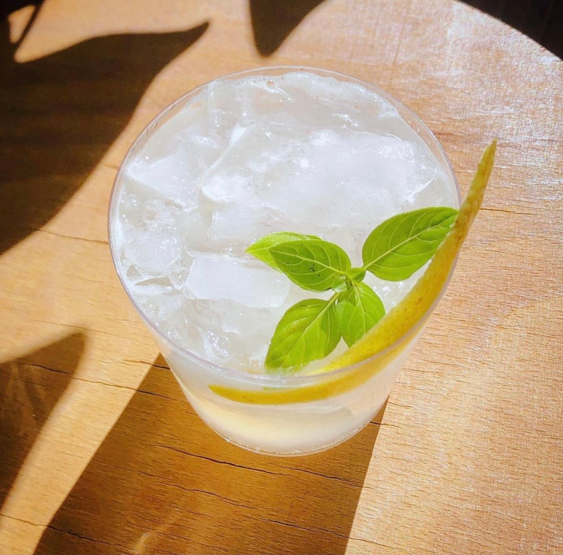 Pour finir servir dans un verre, ici il s'agit du Old Fashioned Nude et garnir d'un zeste de citron et d'une tête de basilic bio!
